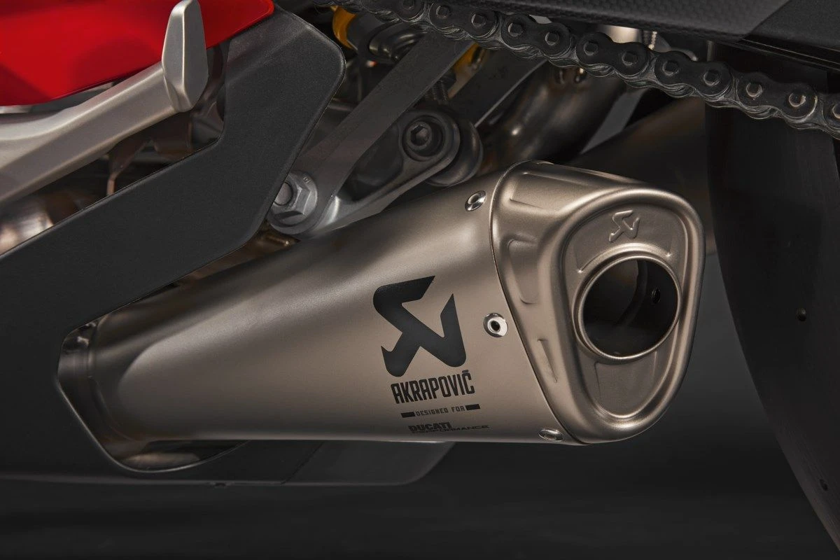 Van de productie-expertise van AkrapoviÄŤ, het meest geavanceerde complete racesysteem dat op de markt verkrijgbaar is, ontwikkeld door Ducati Corse-technici op basis van de uitlaat die is gemonteerd op de Panigale V4 R-motoren die worden gebruikt in het Wereldkampioenschap Superbike. Elk onderdeel van dit systeem is gemaakt van een speciale titaniumlegering die niet alleen een aanzienlijk lager gewicht garandeert, maar ook een grote weerstand biedt tegen de hoge temperaturen die kunnen worden bereikt. Het uitlaatsysteem verbetert de toch al hoge verhouding tussen gewicht en vermogen van de Panigale V4-fiets aanzienlijk. Uitgerust met een race-afgeleid polyester luchtfilter dat niet alleen beter doorlaatbaar is, maar ook een uitstekend filtervermogen en eenvoudig onderhoud garandeert. Topprestaties niet alleen dankzij de racematerialen maar ook de meegeleverde kaart, die alle parameters van DTC – DWC – DPL en DSC aanpast aan de nieuwe prestaties van de motor. Het race-uitlaatsysteem versterkt het onmiskenbare uiterlijk van de Panigale V4 en geeft hem een ​​extra vleugje agressiviteit. Een echte race-replica ook voor het typische geluid.
