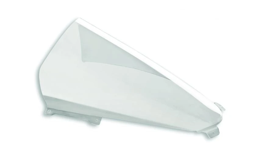 Ducati Koplampbescherming. Deze aerodynamische koplampbescherming zorgt zelfs bij lage snelheden voor optimale windgeleiding en bescherming. De vorm van de koplampbescherming past perfect bij de sportieve lijnen van de motor.