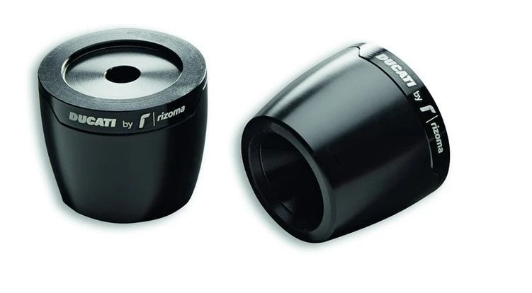 Ducati stuurgewichten. Deze stuurgewichten zijn gemaakt van billet aluminium en zijn een uniek accessoire voor de motor. De stuurgewichten zijn gemaakt in samenwerking met Rizoma.