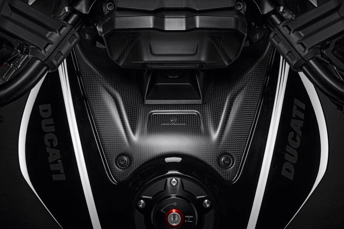De hoogwaardige materialen en de unieke afwerking van koolstofvezel creëren een prachtig detail, ontworpen om de voorkant van de tank te verfraaien en de motor een extra vleugje karakter te geven.