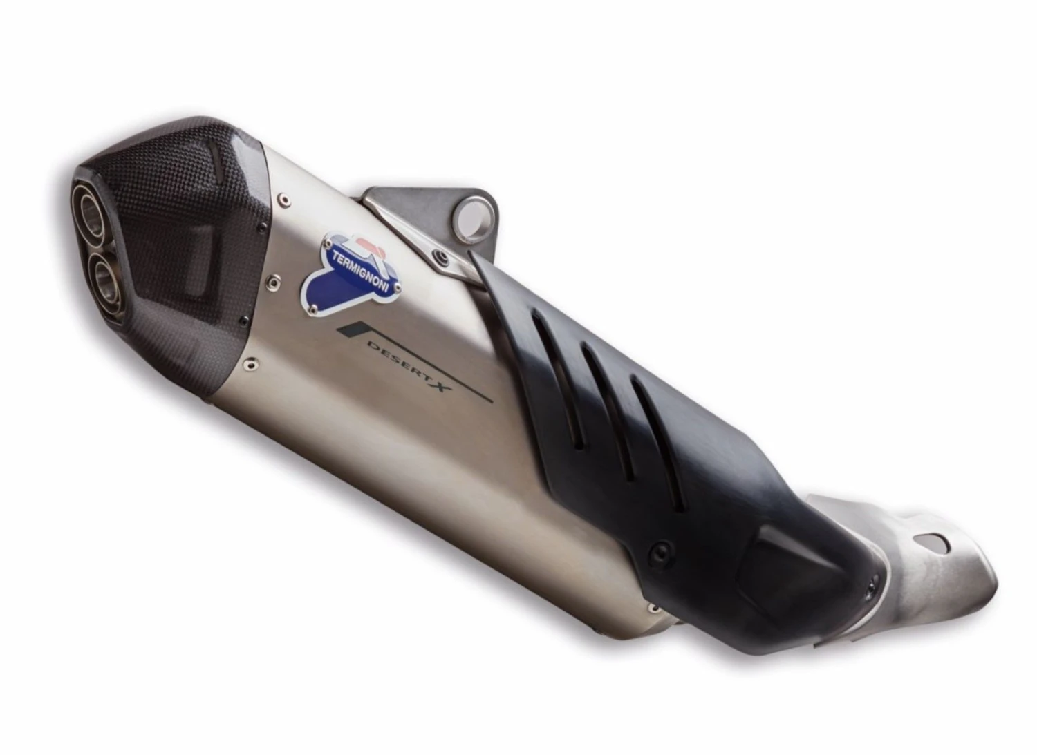 Gehomologeerde demper met carbon eindkap en titanium voering, ontwikkeld om het sportieve karakter van de nieuwe DesertX te ontketenen. Vervaardigd in samenwerking met Termignoni, levert het opwinding op het eerste gezicht en zorgt voor een nog opwindender rijervaring.