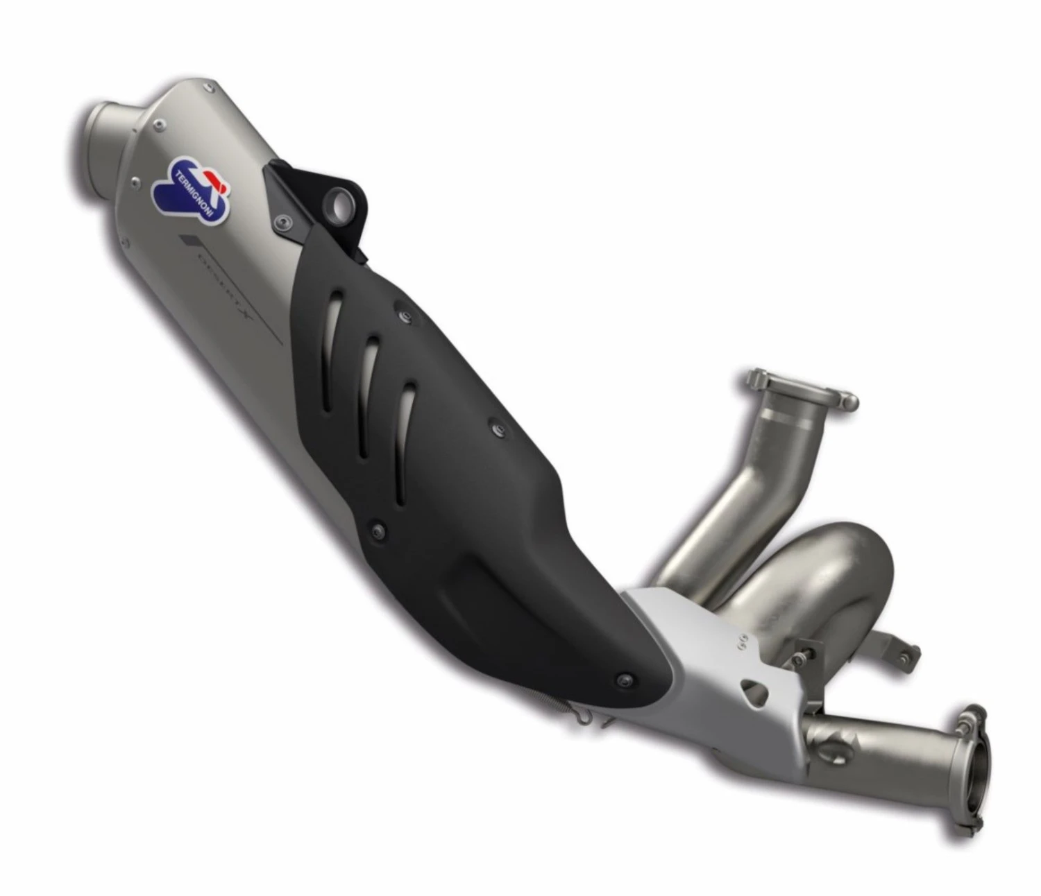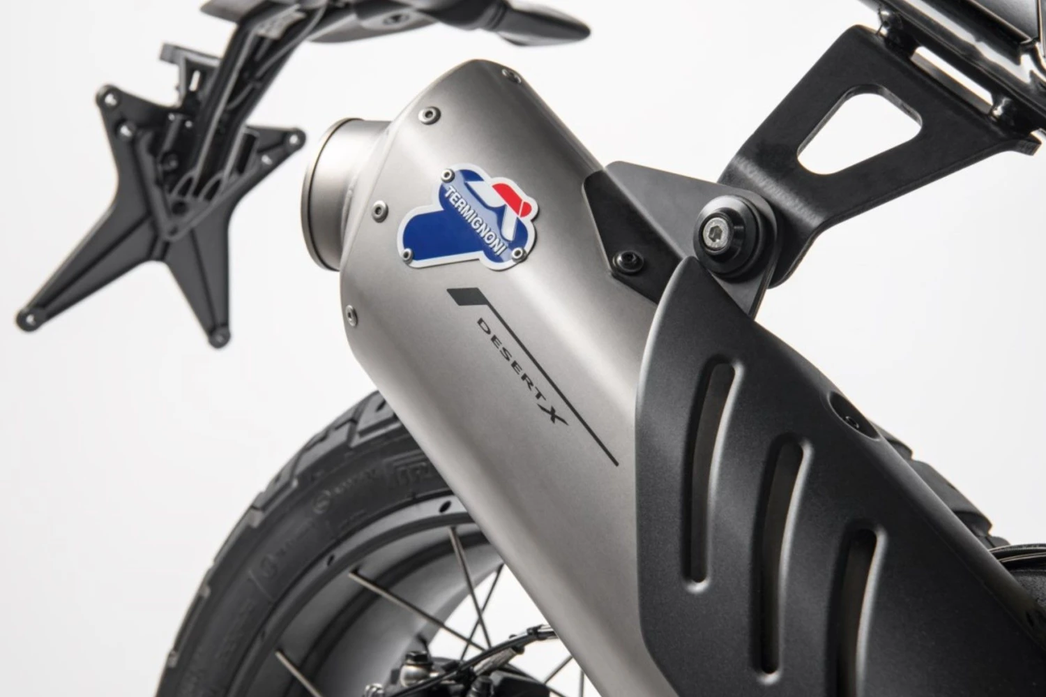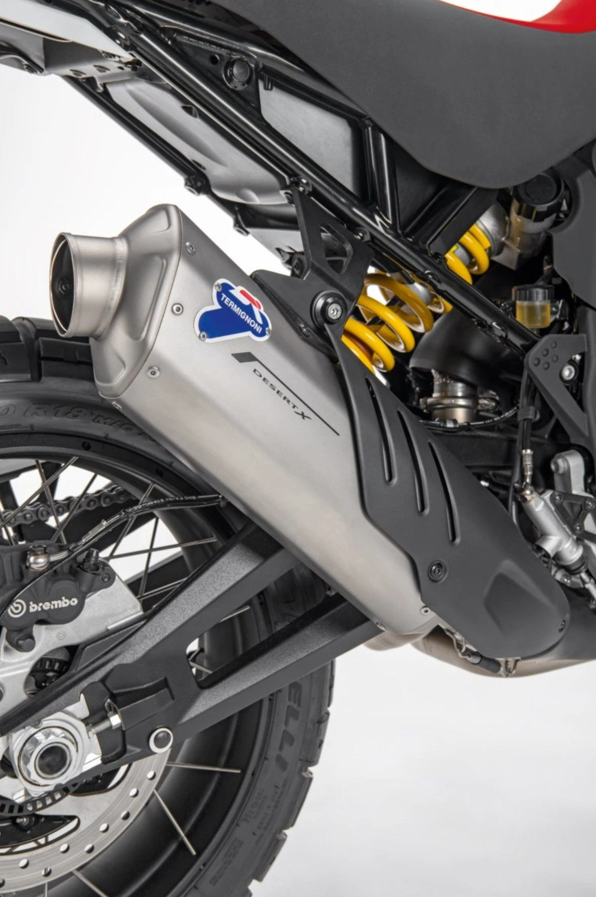 Racing uitlaatsysteem vervaardigd door Termignoni, met titanium voering en eindkap. De speciale kaart maximaliseert kracht en prestaties en levert een opwindend geluid. Een accessoire dat is ontwikkeld om de prestaties en het ongetemde karakter van de DesertX op en naast de weg te verbeteren.