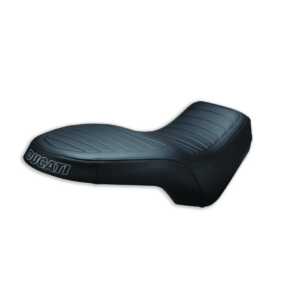 Ducati verlaagd zadel. Dit verlaagde zadel zorgt ervoor dat de Scrambler voor iedereen comfortabel te berijden is zonder af te doen van het comfort en het design.